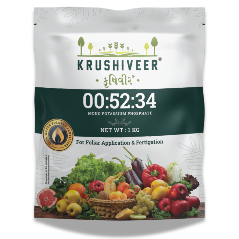 Mono Potassium Phosphate (00:52:34) delivers 52% Phosphorus and 34% Potash in a fully water soluble form. It enhances flowering, improves fruit colour and taste, and ensures proper ripening. A chloride-free fertilizer for high-value crops like fruits and vegetables.